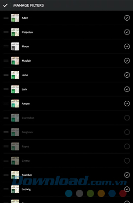 Tiếp tục chạm vào biểu tượng ba dấu gạch ngang ở đầu mỗi filter, giữ để di chuyển (lên / xuống), thay đổi vị trí các bộ lọc này theo ý muốn (những bộ lọc được đưa lên đầu sẽ xuất hiện trước, những bộ lọc không được đánh dấu sẽ không xuất hiện ra ngoài).