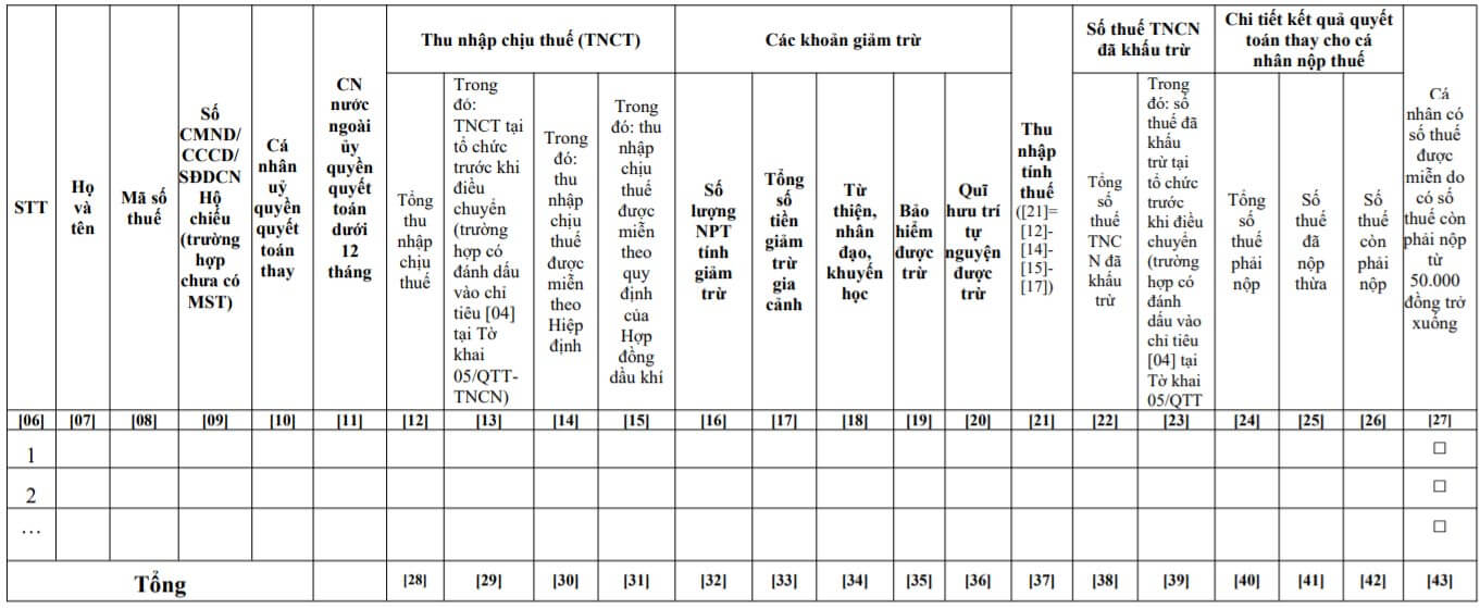 (Kèm theo tờ khai quyết toán thuế thu nhập cá nhân mẫu số 05/QTT-TNCN)