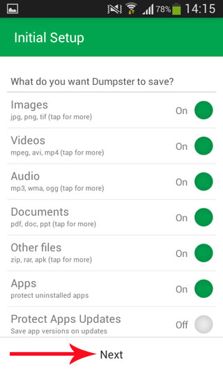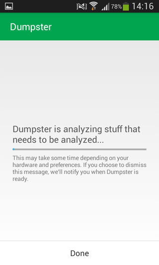 Sau khi hoàn thành cài đặt bấm Next, đợi vài giây để Dumspter phân tích các tập tin trong điện thoại của bạn.