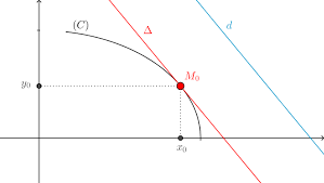 Tiếp tuyến của một đường cong tại một điểm bất kì thuộc đường cong là một đường thẳng chỉ "chạm" vào đường cong tại điểm đó. Tiếp tuyến như một đường thẳng nối một cặp điểm gần nhau vô hạn trên đường cong. Chính xác hơn, một đường thẳng là một tiếp tuyến của đường cong y = f (x) tại điểm x = c trên đường cong nếu đường thẳng đó đi qua điểm (c, f (c)) trên đường cong và có độ dốc f '(c) với f ' là đạo hàm của f.