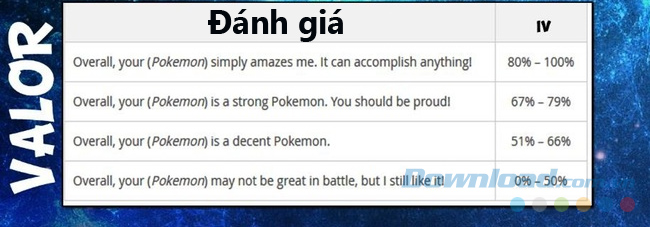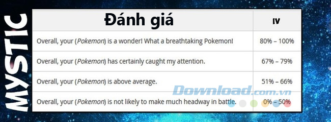 Nếu các bạn cho rằng những đoạn thoại ở tính năng mới này chỉ là "vu vơ" thì đã mắc sai lầm rất lớn. Bởi từ những nhận xét đó, có thể suy ra tương đương chỉ số IV của Pokemon đó, cụ thể: