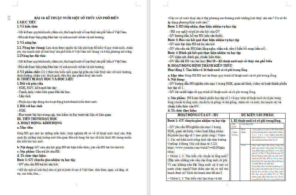 Giáo án Công nghệ 12 Kĩ thuật nuôi một số loài thuỷ sản phổ biến