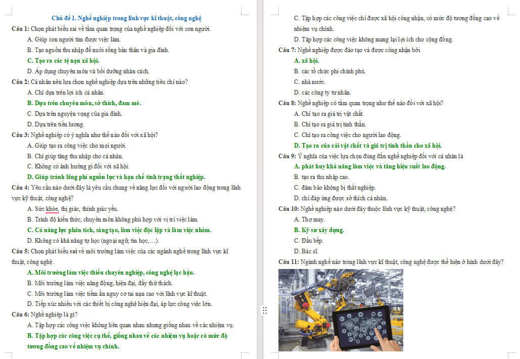 Trắc nghiệm Công nghệ 9 Bài 1 Nghề nghiệp trong lĩnh vực kĩ thuật và công nghệ