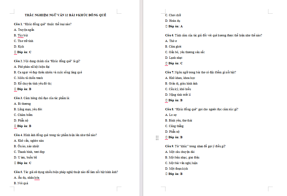 Trắc nghiệm Ngữ văn 12 Bài 9: Khúc đồng quê