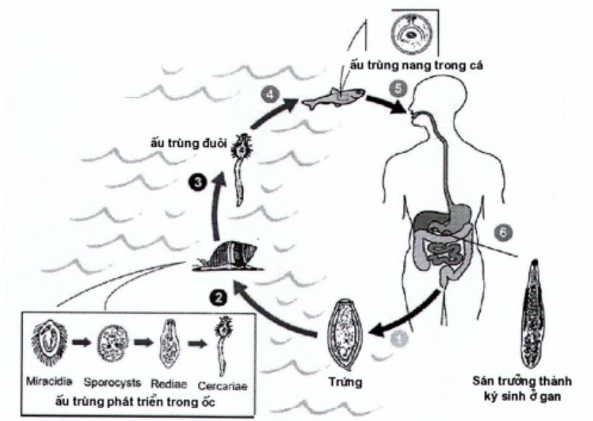 (4) Giai đoạn ở cá: Ấu trùng đuôi xâm nhập vào cá nước ngọt, rụng đuôi phát triển thành ấu trùng nang ký sinh trong cá (metacercariae).