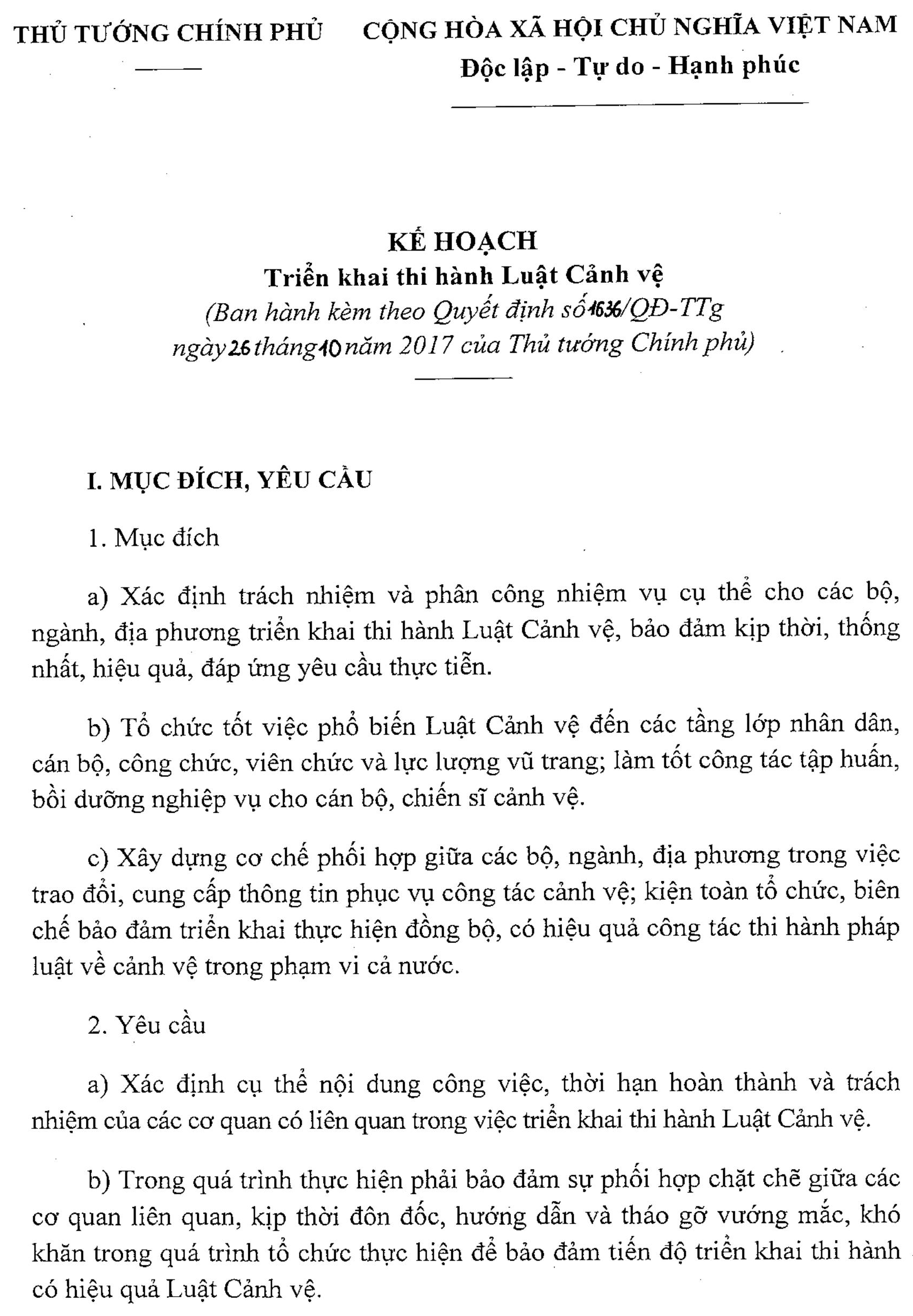 Tìm hiểu thêm »Ngày 26/10/2017, Thủ tướng Chính phủ đã ban hành Quyết định 1636/QĐ-TTg về kế hoạch triển khai thi hành Luật Cảnh vệ. Quyết định có hiệu lực kể từ ngày ban hành. Sau đây là nội dung chi tiết, mời các bạn cùng tham khảo.