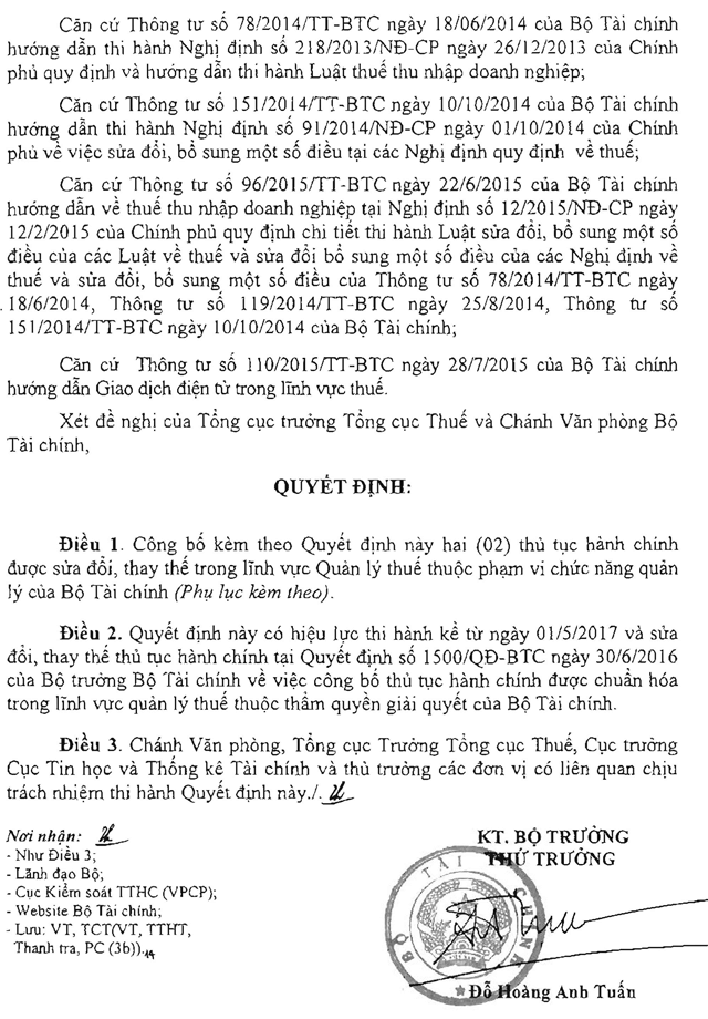 Tìm hiểu thêm »Bộ Tài chính đã ban hành Quyết định 2706/QĐ-BTC năm 2017 về công bố thủ tục hành chính được sửa đổi, thay thế trong lĩnh vực quản lý thuế thuộc thẩm quyền giải quyết của Bộ Tài chính. Theo đó, sửa đổi thay thế 2 thủ tục hành chính trong lĩnh vực quản lý thuế thuộc phạm vi chức năng của Bộ Tài chính. Mời các bạn cùng tham khảo nội dung chi tiết Quyết định tại đây.