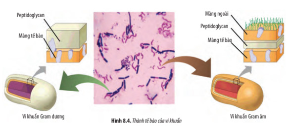 Câu 4: Quan sát Hình 8.4, hãy cho biết sự khác nhau giữa thành tế bào của vi khuẩn Gram âm và Gram dương.