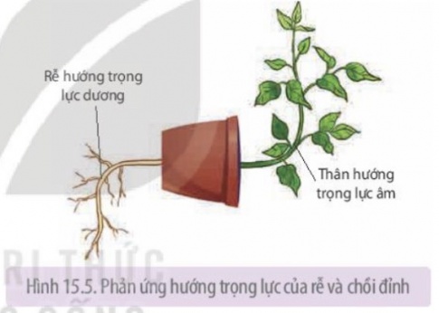Dựa trên cơ chế hướng động, giải thích về phản ứng hướng trọng lực dương của rễ cây trong hình 15.5 dưới tác động của auxin.