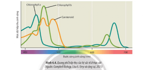 Câu hỏi 3: Quan sát Hình 4.3 và 4.4, hãy cho biết hệ sắc tố ở thực vật gồm những nhóm nào? Vai trò của mỗi nhóm sắc tố đó là gì?