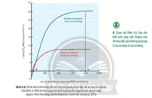 Câu hỏi 8: Quan sát Hình 4.8, hãy cho biết ánh sáng ảnh hưởng như thế nào đến quá trình quang hợp ở cây ưa sáng và cây ưa bóng.