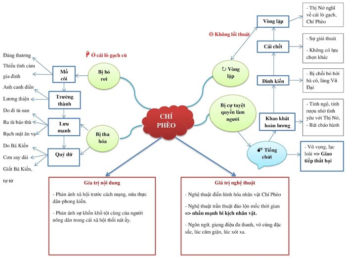Chí Phèo là một trong những tác phẩm văn học kinh điển của Việt Nam. Chí Phèo được viết vào năm 1941 dựa vào hình ảnh cái lò gạch bị bỏ hoang xuất hiện đầu và cuối câu chuyện cho thấy sự quẩn quanh bế tắc trong cuộc sống. Để hiểu rõ hơn về tác phẩm mời các bạn theo dõi qua sơ đồ tư duy Chí phèo dưới đây. Ngoài ra các bạn xem thêm một số bài văn mẫu cảm nhận về nhân vật Chí Phèo, phân tích tác phẩm Chí Phèo, phân tích nhân vật Chí Phèo, phân tích quá trình tha hóa của Chí Phèo, phân tích quá trình hồi sinh hay phân tích nhân vật Thị Nở.