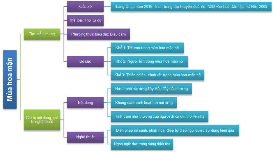 Bài thơ Mùa hoa mận được Chu Thuỳ Liên sáng tác năm 2007 đã thể hiện nỗi nhớ sâu sắc về quê hương, buôn làng của những người đi xa thông qua sắc trắng quen thuộc đó. Bài thơ có ba khổ thơ giúp bạn đọc cảm nhận được vẻ đẹp cùng không khí rộn ràng của quê hương vào những ngày xuân sang. Để hiểu rõ hơn về tác phẩm, mời các bạn cùng theo dõi Sơ đồ tư duy Mùa hoa mận trong bài viết dưới đây.
