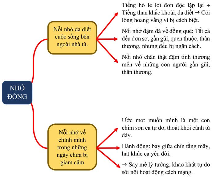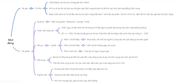 Nhớ đồng là bài thơ rất hay của Tố Hữu đã phản ánh tâm trạng cô đơn, buồn nhớ của người tù trẻ tuổi bị tách biệt khỏi môi trường hoạt động sôi nổi, phải xa đồng bào, đồng chí thân thương. Vậy sau đây là trọn bộ sơ đồ tư duy bài Nhớ đồng mời các bạn cùng tham khảo. Bên cạnh đó các bạn xem thêm bài văn mẫu phân tích Nhớ đồng.