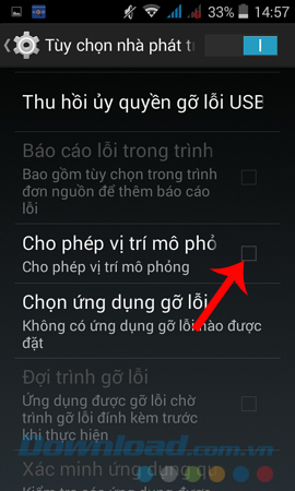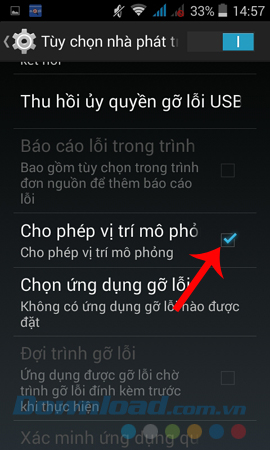 Bước 4: Lúc này, một mục mới tên là "Tùy chọn nhà phát triển - Developer Options" sẽ xuất hiện, các bạn vào đây và bỏ dấu tick trong mục Cho phép vị trí mô phỏng - Allow mock locations đi, sau đó khởi động lại máy và vào chơi lại.