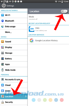 Bước 1: Đầu tiên, chúng ta cũng cần kiểm tra lại chắc chắn, đã bật dịch vụ định vị hay chưa? ở mỗi phiên bản, mỗi thiết bị Android sẽ có những thay đổi khác nhau, nhưng cách chung nhất là vào Settings - Location và kích hoạt bằng nút bật/tắt bên trên.