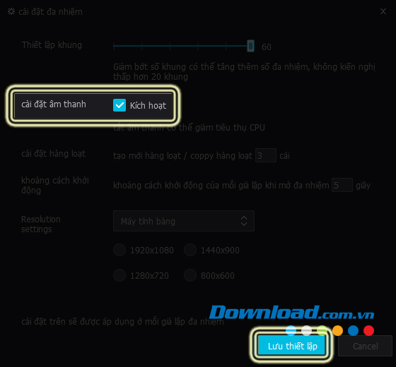 Bước 6: Nhấn chuột trái vào thẻ Cài đặt đa nhiệm - Multi-instance settings, tìm mục Cài đặt âm thanh - Sounds, kiểm tra xem ô Kích hoạt - Enable có được tick hay chưa?