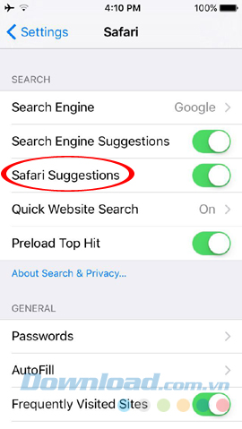 Bước 2: Tại đây, chúng ta gạt thanh trượt Safari Suggestions sang trái để tắt đi.