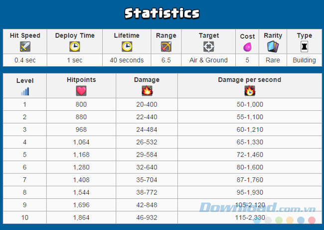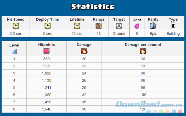 Với mức xếp hạng 5 sao, đây là một trong những vũ khí mạnh nhất và đa năng nhất trong game Clash Royale. Inferno Tower được xuất hiện ở Arena 4, vừa tấn công trên bầu trời, đồng thời vẫn có thể tấn công dưới đất, đây là mối đe dọa thực sự với bất kỳ kẻ thù nào (dù cho chúng có "trâu" đến đâu).
