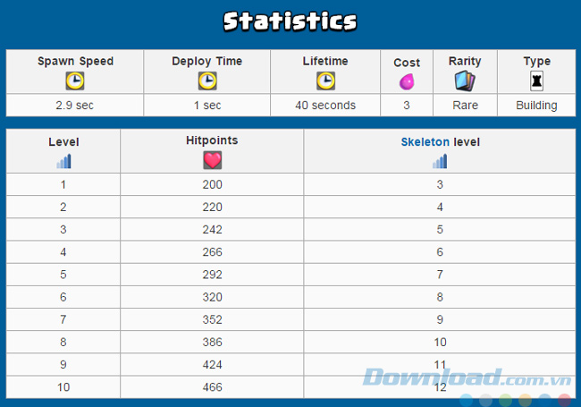 Về bản chất, Tomb Stone khá giống Goblin Hut khi có khả năng "triệu hồi" những bộ xương (Skeletons) từ địa ngục. Được mở khóa từ Arena 2, skeletons có khả năng đánh lạc hướng và thu hút hướng tấn công của kẻ thù vào các tòa tháp. Một điểm khá hay của công trình này là khi nó bị phá hủy, sẽ có thêm 4 skeletons khác được sinh ra.