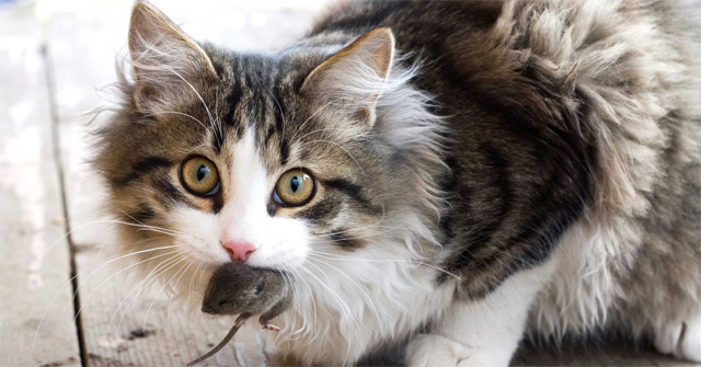 Cắp con chuột trên miệng, Miu ta hiên ngang mang chiến lợi phẩm ra ngoài khoe với chủ, ai nhìn thấy cũng khen Miu giỏi.