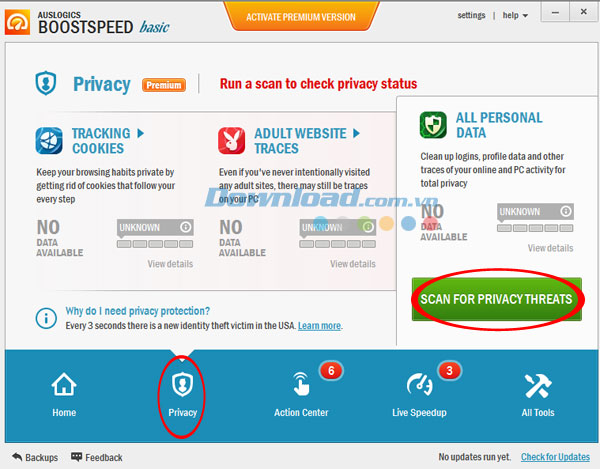 Ngoài ra, chương trình còn cung cấp cho người dùng khả năng kiểm tra sự riêng tư của mình khi duyệt web trên Internet. Hãy nhấn chuột vào nút Privacy ở góc bên trái dưới cùng của cửa sổ và nhấn nút Scan for Privacy Threats ở bên phải để kiểm tra các mối đe dọa đến sự riêng tư.