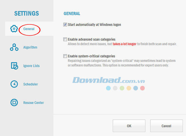 Trong mục General, bạn có thể lựa chọn tự động khởi chạy chương trình cùng lúc với Windows, kích hoạt các mục quét nâng cao hoặc một số mục quan trọng với hệ thống.