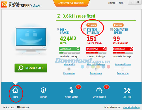 Nhấn biểu tượng Home quay trở lại giao diện chính và chọn System Stability để xem các vấn đề liên quan đến độ ổn định của hệ thống. Lưu ý, tính năng này chỉ có sẵn ở phiên bản Premium.