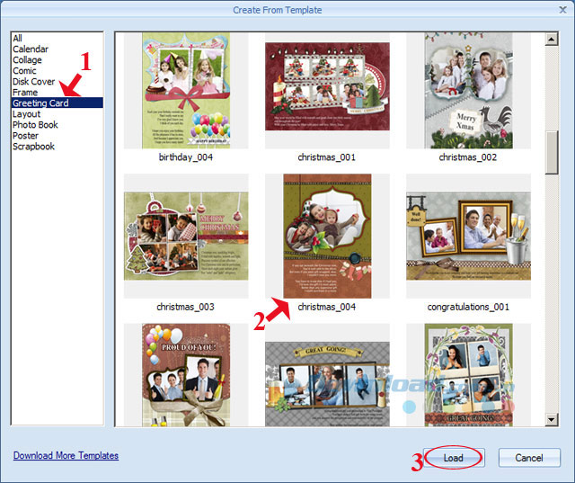 Bước 2: Tiếp theo nhấn vào thẻ Greeting Card ở cột bên trái màn hình, sau đó chọn mẫu thiệp đúng chủ đề Giáng sinh ở bên phải màn hình. Khi chọn được mẫu thiệp ưng ý thì nhấn vào Load.