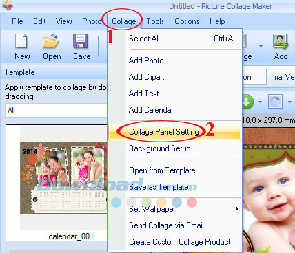 Bước 5: Mặc định kích cỡ được chọn cho tấm thiệp là 800 x 600. Nếu muốn thay đổi kích cỡ cho tấm thiệp Giáng sinh thì nhấn vào thẻ Collage, chọn Collage Panel Settings.