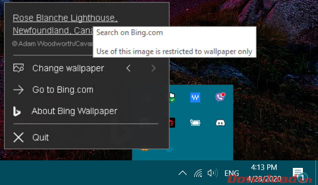 Lúc này, màn hình nền của bạn sẽ được tự động đổi sang màn hình của Bing Wallpaper. Từ bây giờ, mỗi khi khởi động máy thì ứng dụng cũng sẽ tự động chạy song song với Windows và không hề tốn nhiều dung lượng Ram. Để thay đổi màn hình nền, ta nhấn chuột phải vào biểu tượng Bing ở góc phải thanh Taskbar và chọn nút hình mũi tên ở dòng Change wallpaper. Để thoát ứng dụng, ta nhấn chọn nút Quit.