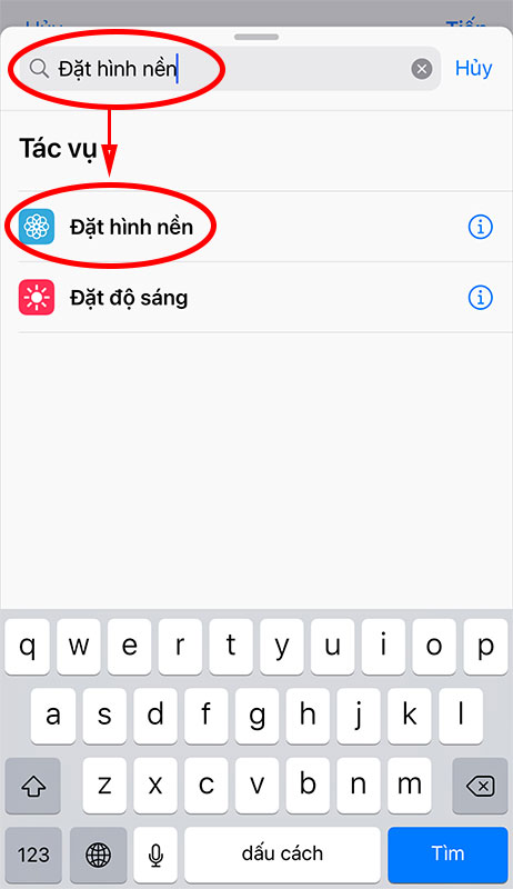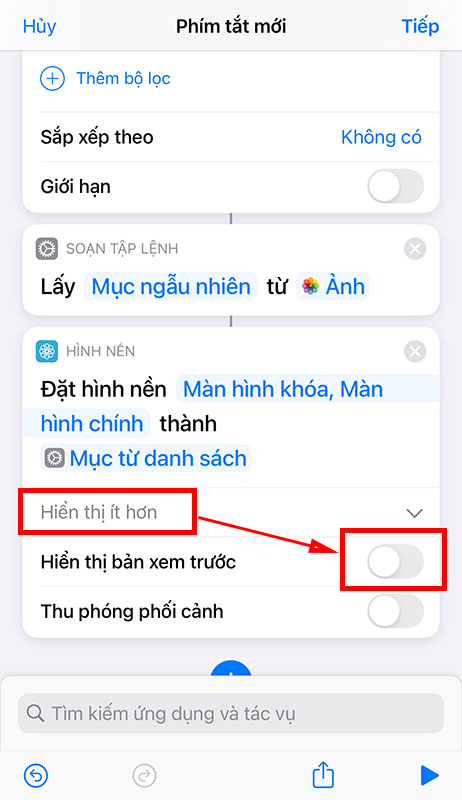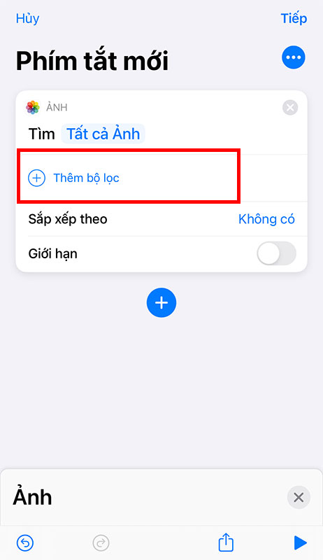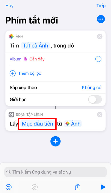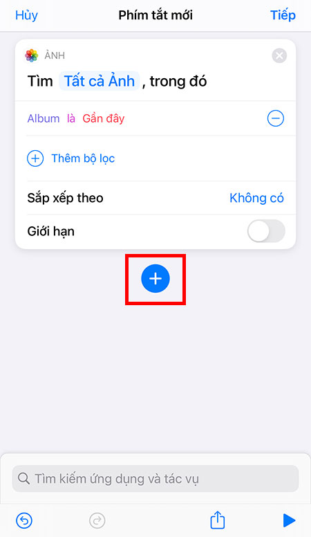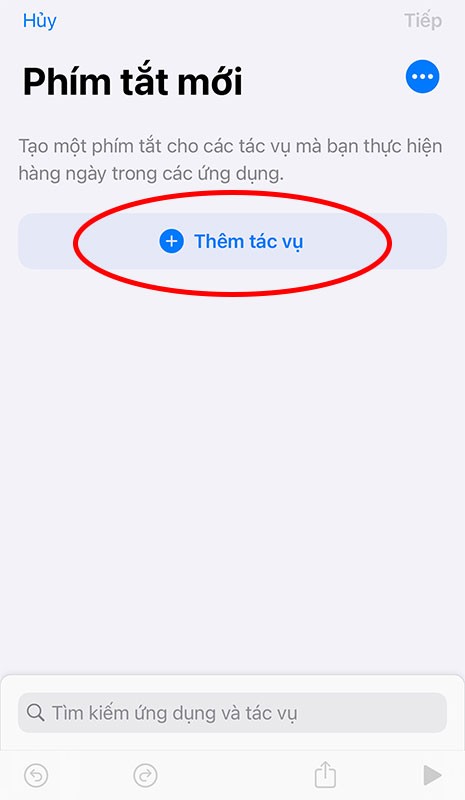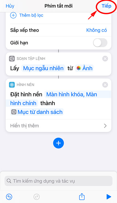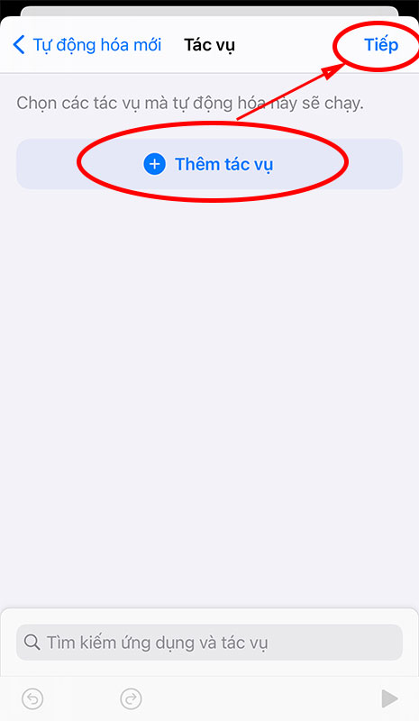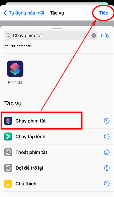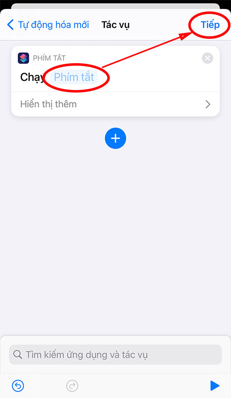 Ở màn hình tiếp theo nhấn nút Thêm tác vụ -> Chạy phím tắt -> Tiếp.