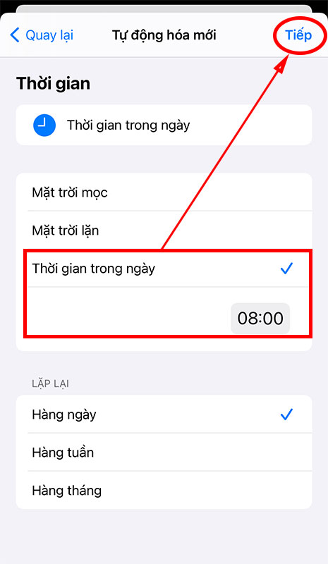 Nhấn chọn Thời gian trong ngày sau đó thiết lập thời gian muốn thay đổi màn hình nền mà bạn muốn -> Nhấn chọn nút Tiếp.