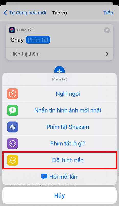 Chọn phần Phím tắt sau đó chọn tác vụ Đổi hình nền lúc nãy vừa mới tạo và nhấn nút Tiếp.
