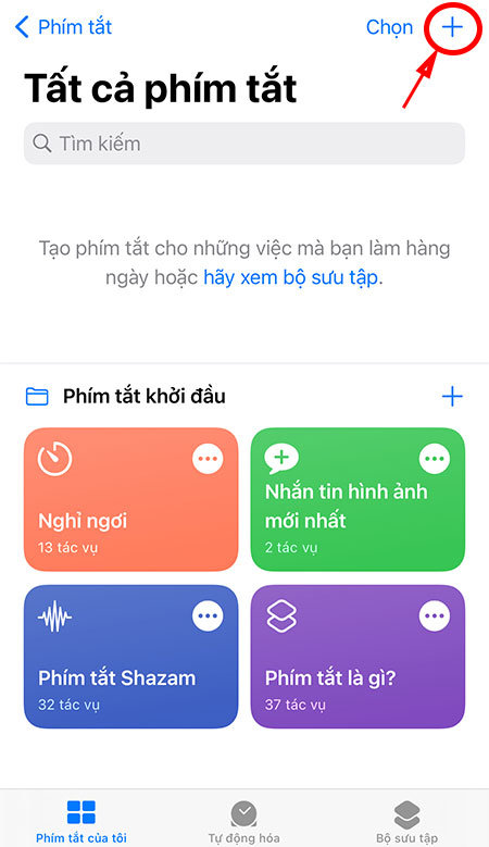 Ở màn hình chính các bạn nhấn chọn nút Phím tắt, sau đó nhấn nút dấu cộng ở góc trên bên phải để thêm tác vụ.