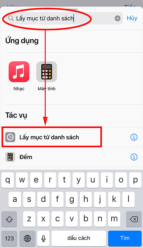 Tiếp theo sử dụng phần tìm kiếm để tìm tác vụ có tên Lấy mục từ danh sách.