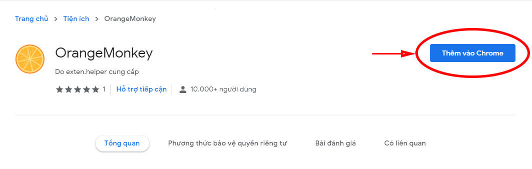 Đầu tiên các bạn vào trang tải tiện ích OrangeMonkey trên Cửa hàng Chrome. Ở màn hình hiện ra nhấn chọn nút Thêm vào Chrome.