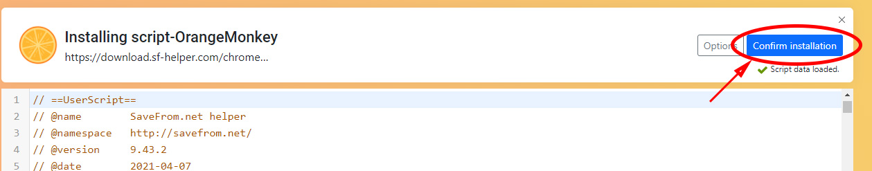 Tiêp theo hãy nhấn nút Thêm script savefrom.net phía dưới sau đó nhấn chọn nút Confirm installation để xác nhận việc cài đặt tiện ích này vào chrome.