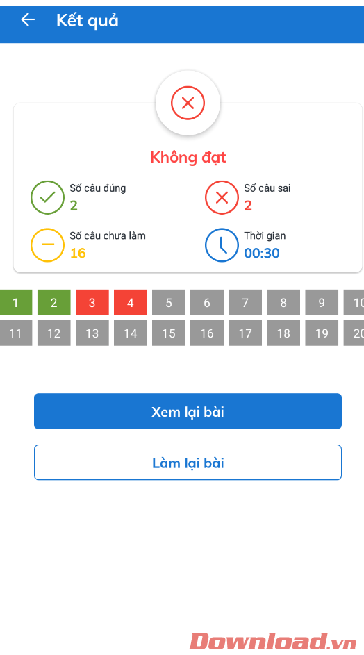 Sau khi đã nộp bài, bạn sẽ nhận được kết quả ngay lập tức. Kết quả sẽ thông báo Đạt hoặc Không đạt và chỉ ra những lỗi sai cụ thể của bạn. Nếu chưa hài lòng hoặc muốn luyện tập lại, bạn có thể nhấn nút Làm lại bài.