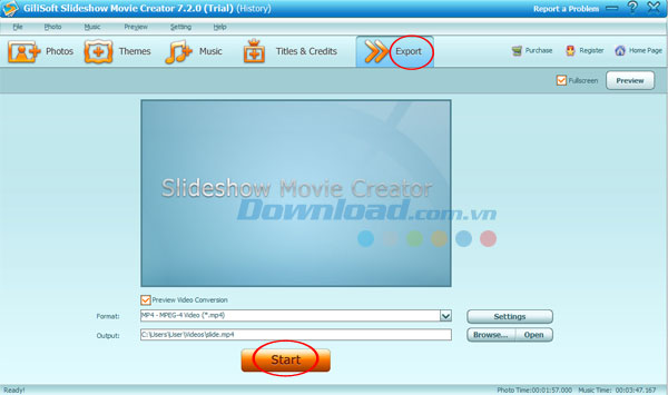 Cuối cùng, nhấn nút Export và bấm Start để bắt đầu tiến trình tạo slideshow ảnh của bạn.