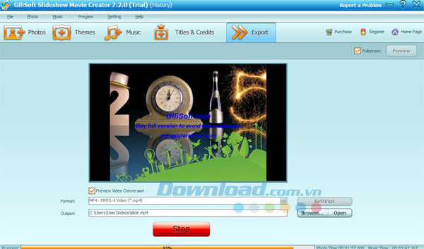Quá trình đang diễn ra, vui lòng chờ đợi trong giây lát. Một hạn chế ở phiên bản dùng thử của phần mềm đó là không xóa được watermark hiển thị trên trình chiếu. Bên cạnh đó, bạn có thể xem trước trình chiếu khi nhấn nút Preview.