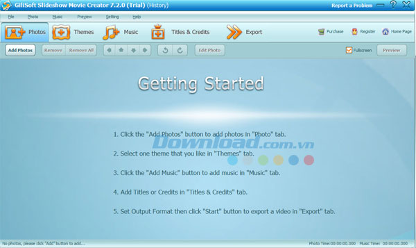 Sau khi cài đặt Slideshow Movie Creator trên máy tính, bạn sẽ nhìn thấy giao diện như bên dưới: