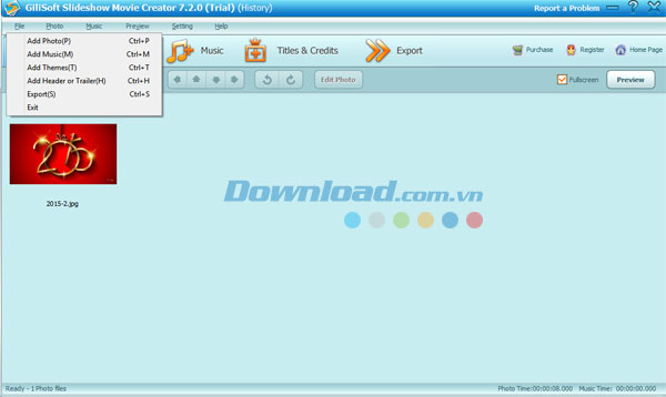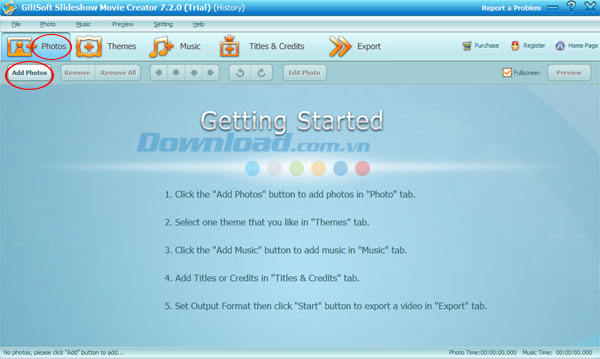 Nhấp chuột vào tùy chọn Photos -> Add Photos hoặc nhấn File -> Add Photo để thêm ảnh vào giao diện chính của Slideshow Movie Creator.