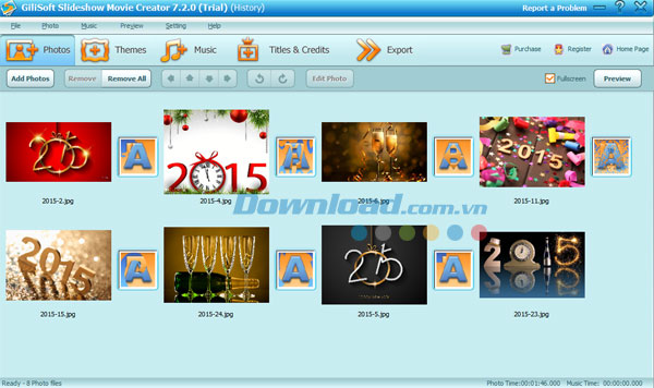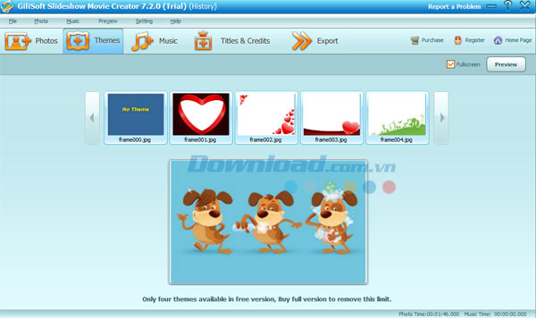 Sau khi thêm xong ảnh, nhấn nút Themes ở phía trên của giao diện để lựa chọn theme yêu thích. Slideshow Movie Creator cung cấp sẵn cho bạn 4 theme miễn phí trong phiên bản dùng thử này.