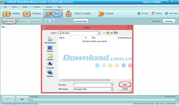 Tiếp theo, chèn nhạc cho trình chiếu bằng cách nhấn nút Music. Sau đó, nhấn Add Music để thêm file nhạc trong máy tính và hộp thoại Open sẽ hiện ra để cho phép bạn lựa chọn tập tin audio mình cần.
