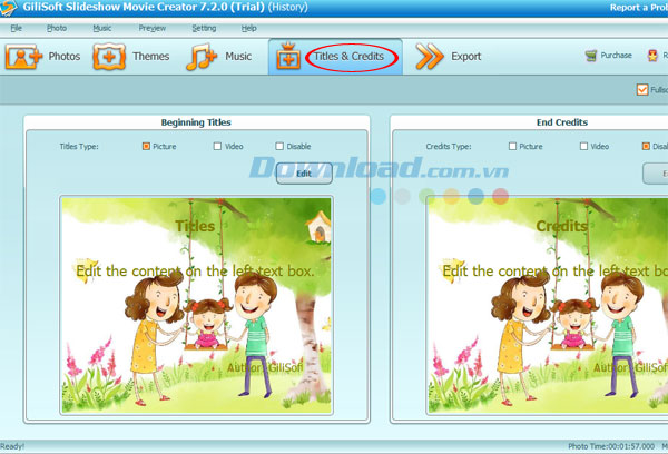 Bước kế tiếp, chọn Title và Credit cho slideshow ảnh của bạn. Vui lòng, nhấn chuột vào tùy chọn Titles & Credits.