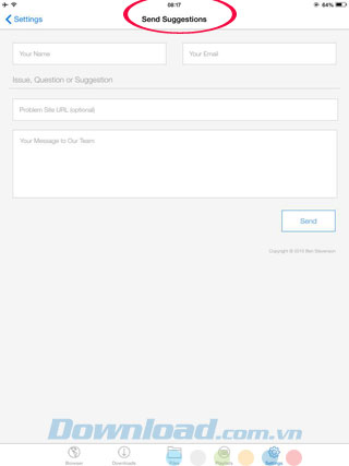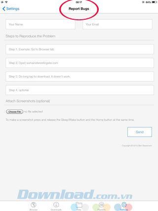 Phần Report Bugs cũng tương tự như tùy chọn Send Suggestions. Người dùng cần điền tên và địa chỉ Email của mình. Ở phần các bước báo lỗi, bạn cần nhập thông tin của 4 bước để tạo ra lỗi đó. Ví dụ như: bước 1 - truy cập thẻ Browser; bước 2 - mở trang web bất kỳ có hỗ trợ chia sẻ video, bước 3 - phát video để xuất hiện tùy chọn Download... Bạn có thể đính kèm ảnh minh họa khi xuất hiện lỗi (không bắt buộc). Cuối cùng nhấn Send để gửi form báo lỗi.
