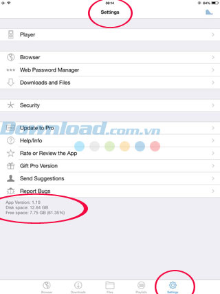 Tại đây bạn sẽ thấy rất nhiều mục con của phần Settings. Bên dưới trang là thông tin về ứng dụng, bao gồm phiên bản, bộ nhớ ổ đĩa và bộ nhớ còn trống của máy. Thông tin này sẽ giúp bạn dễ dàng quản lý video tải về máy.