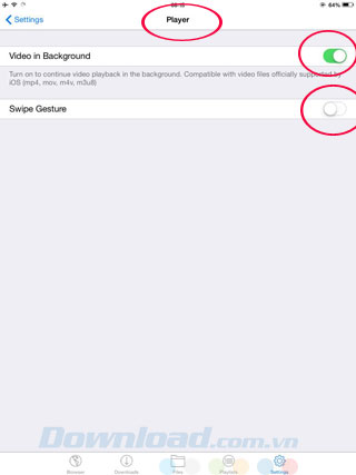 Nhấn chọn mục Player để thiết lập trình phát video. Tại đây bạn có thể bật chức năng Video in Background để phát video trên màn hình nền. Tính năng này tương thích với các tệp tin video được hỗ trợ bởi iOS như mp4, mox, m4v và m3u8. Bên dưới là tùy chọn Swipe Gesture, bật chức năng này để sử dụng cử chỉ ngón tay trong trình phát.