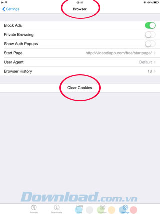 Ở mục Browser, chức năng Block Ads (chặn quảng cáo) được bật ở chế độ mặc định. Ngoài ra, người dùng còn thể bật hoặc tắt một số chức năng khác trong trình duyệt của Free Video Downloader Plus Plus như chế độ duyệt web riêng tư Private Browsing, hiển thị các popup chuẩn Show Auth Popups, thiết lập trang khởi động là trang FAQ ứng dụng hay trang trắng, chế độ User Agent là mặc định / iPhone / Firefox / Custom. Bạn cũng có thể xem lược sử duyệt web gồm những trang đã truy cập, số lượng trang được hiển thị bên cạnh nút Browser History. Phần cuối cùng trong mục Browser là Clear Cookies cho phép bạn xóa mọi cookie.